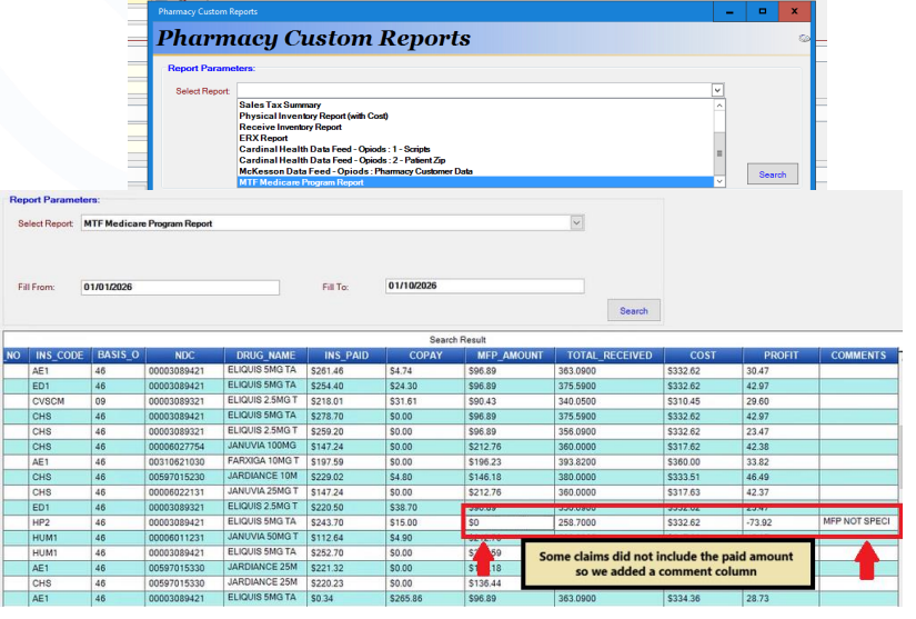 A new custom report deployed on 01/07/2026 will allow pharmacies to identify all MFP claims and see the correct profit. You can access it from the Reports drop-down menu by navigating to Custom Reports.